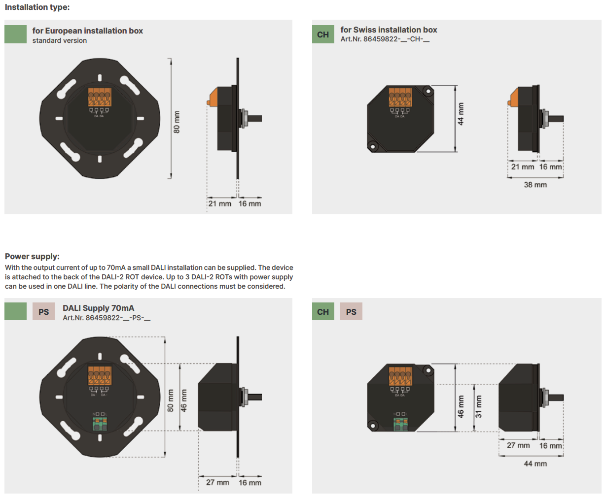 The device was developed to fit the rotary covers and knobs of most manufacturers and to enable their integration in the DALI system.