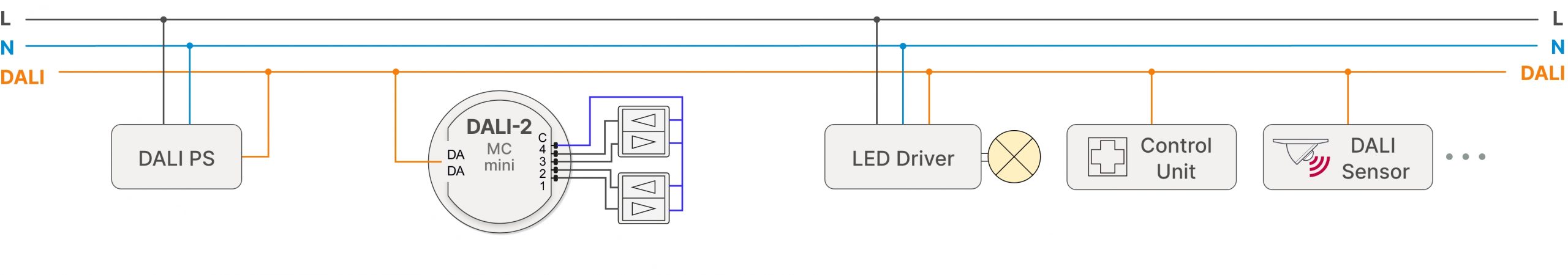 Das Modul kann entweder direkt zur Steuerung des DALI Systems verwendet werden (Application Controller) oder für die Messwerterfassung im Zusammenspiel mit einer zentralen Steuerung dienen (Instanzmodus).