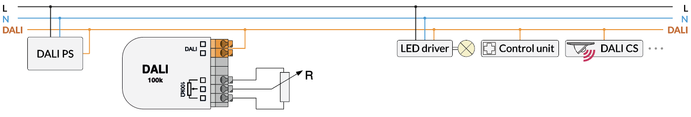 Das DALI 100K ermöglicht die Steuerung von DALI Betriebsgeräten mit einem 100kΩ-Potentiometer. Wirkbereich und Dimmcharakteristik können mit Hilfe der SW DALI Cockpit zugewiesen werden. Das kompakte Gerät kann in die Unterputzdose hinter dem Schalter eingelegt werden.