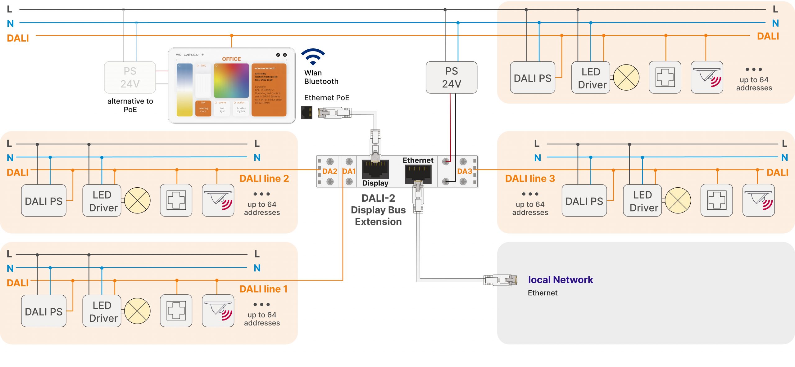 Das Modul wird in Kombination mit einem DALI-2 Display 7“ Plus oder dem DALI-2 7“ Notlicht Displays verwendet. Es ermöglicht eine Erweiterung des DALI Systems um 3 zusätzliche DALI Linien.