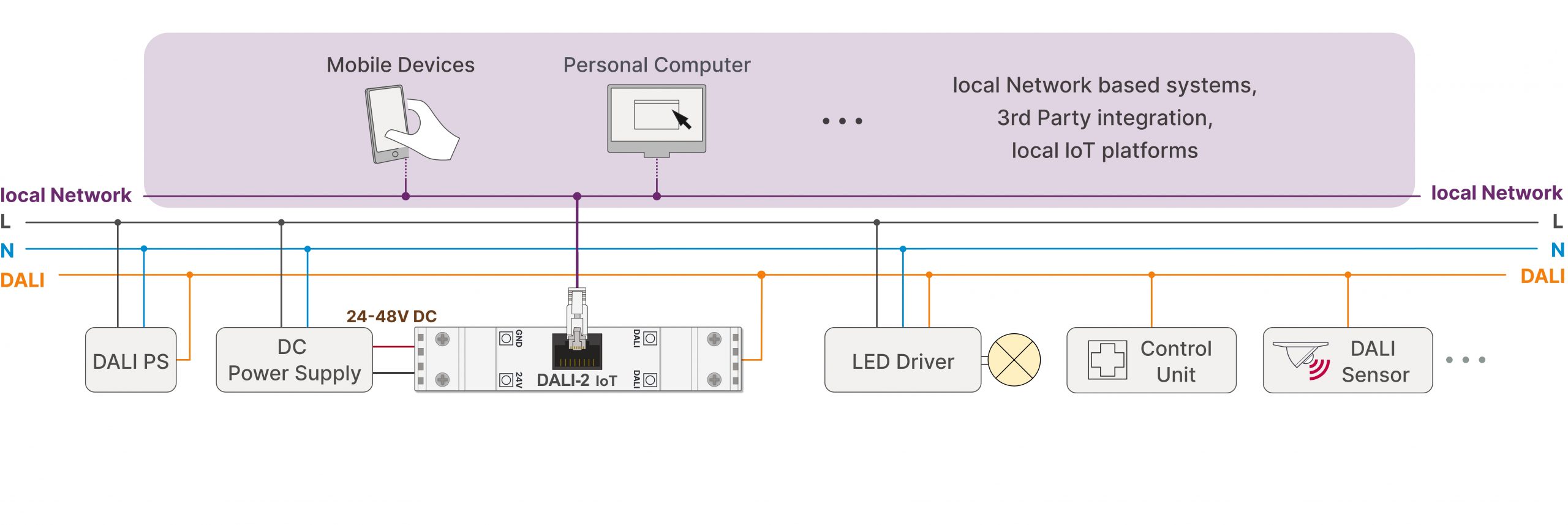 Das DALI-2 IoT Gateway ist eine Schnittstelle zur Verbindung des DALI Bussystems mit intelligenten Geräten über das Internet der Dinge (IoT). Mit dem DALI IoT Gateway ist eine einfache Realisierung eines intelligenten Systems möglich, bei dem über Smartphones, PCs, usw. Geräte gesteuert und überwacht werden können. Auch das Koppeln mehrerer DALI Kreise ist möglich. Es steht eine API Dokumentation zur Verfügung, über die z.B.: Energie Monitoring, Remote Support und zahlreiche weitere Anwendungen umgesetzt werden können (RESTFul API-Endpunkte und WebSocket mit JSON-Syntax, verschlüsselt (optional unverschlüsselt) für benutzerdefinierte Integrationen).