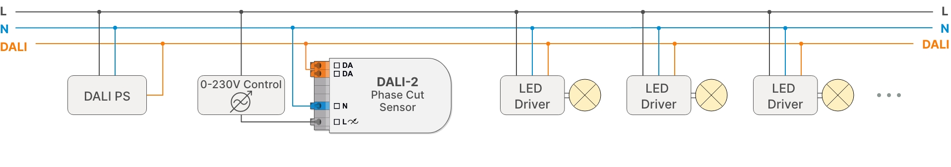 Das kompakte Schnittstellenmodul wandelt 0–230V PhaseCut Steuersignale in DALI Dimmwerte um.