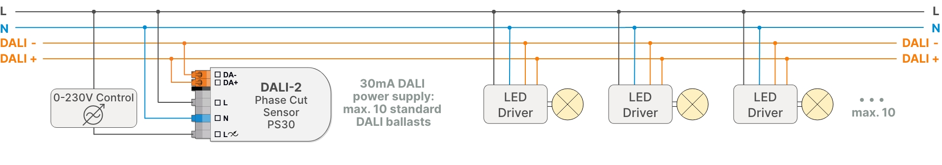 Die Version mit integrierter DALI Busversorgung (Art. Nr 86468411-PS) liefert 30mA für bis zu 10 standard DALI Betriebsgeräte.