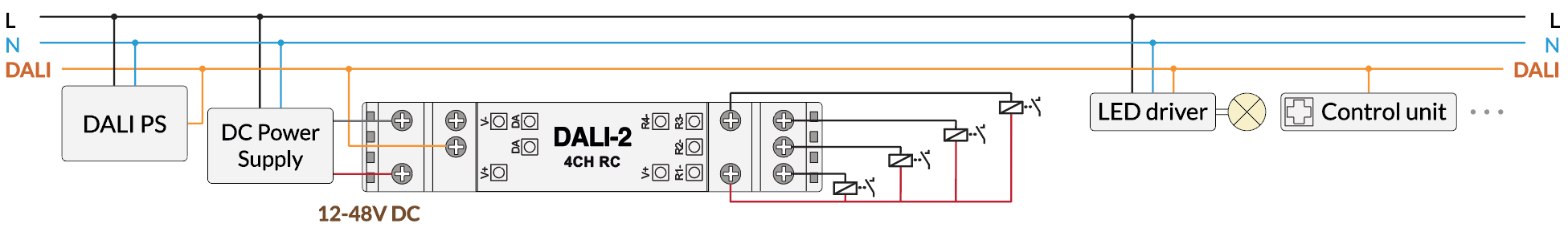 DALI Relais Controller mit 4 Kanälen. Jeder Kanal verfügt über eine eigene DALI Adresse. Geeignet zum Ansteuern von Relais und Schützen mit einer Steuerspannung von 12V-48V DC. Varianten für Deckeneinwurf und Hutschienenmontage stehen zur Verfügung.