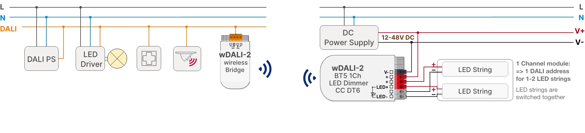 Die drahtlosen Steuerung funktioniert über eine Sendeeinheit wDALI-2 BT5 Bridge und dem Empfangsmodul wDALI-2 1Ch LED Dimmer.